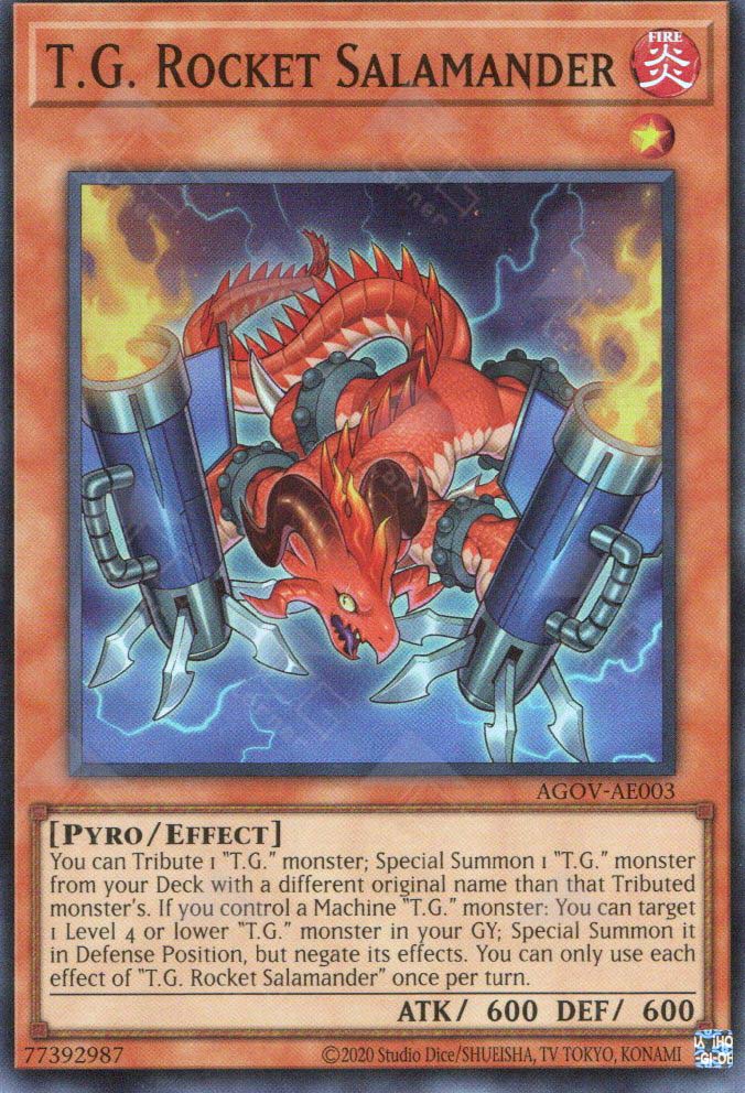 You can Tribute 1 “T.G.” monster; Special Summon 1 “T.G.” monster from your Main Deck with a different original name than that Tributed monster’s. If you control a Machine “T.G.” monster: You can target 1 Level 4 or lower “T.G.” monster in your GY; Special Summon it in Defense Position, but negate its effects. You can only use each effect of “T.G. Rocket Salamander” once per turn.