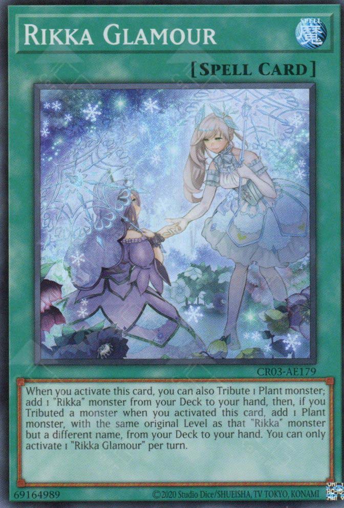 When you activate this card, you can also Tribute 1 Plant Monster Card; Add a card 1 “Rikka” monster from your Main Deck to your hand, then, if you Tributed a monster when you activated this card, add 1 Plant monster, with the same original Level as that “Rikka” monster but a different name, from your Deck to your hand. You can only activate 1 “Rikka Glamour” per turn.
