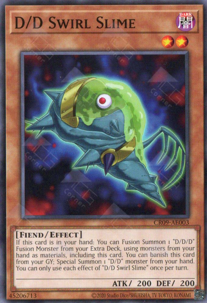 If this card is in your hand: You can Fusion Summon 1 “D/D/D” Fusion Monster from your Extra Deck, using Monster Card from your hand as Fusion Materials, including this card. You can banish this card from your GY; Special Summon 1 “D/D” monster from your hand. You can only use each effect of “D/D Swirl Slime” once per turn.