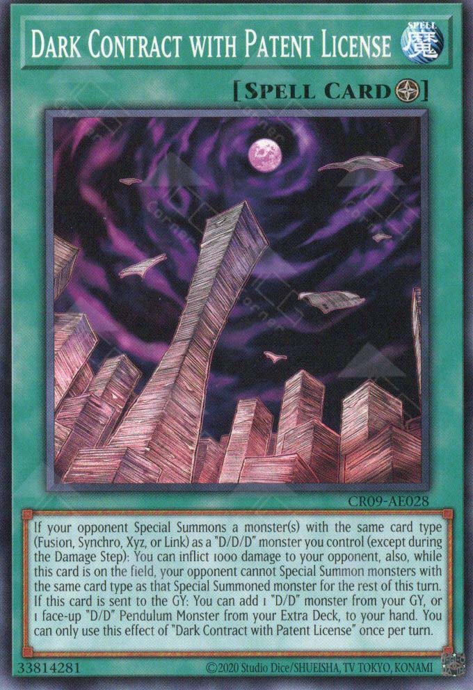 If your opponent Special Summons a monster(s) with the same card type (Fusion Monster, Synchro Monster, Xyz Monster, or Link Monster) as a “D/D/D” monster you control (except during the Damage Step): You can inflict 1000 Effect damage to your opponent, also, while this card is on the field, your opponent cannot Special Summon monsters with the same card type as that Special Summoned monster for the rest of this turn. If this card is sent to the GY: You can Add a card 1 “D/D” monster from your GY, or 1 face-up “D/D” Pendulum Monster from your Extra Deck, to your hand. You can only use this effect of “Dark Contract with Patent License” once per turn.