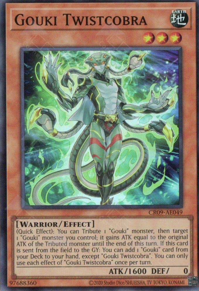 (Quick Effect): You can Tribute 1 “Gouki” Monster Card, then target 1 “Gouki” monster you control; it gains ATK equal to the original ATK of the Tributed monster until the end of this turn. If this card is sent from the field to the GY: You can Add a card 1 “Gouki” card from your Main Deck to your hand, except “Gouki Twistcobra”. You can only use each effect of “Gouki Twistcobra” once per turn.