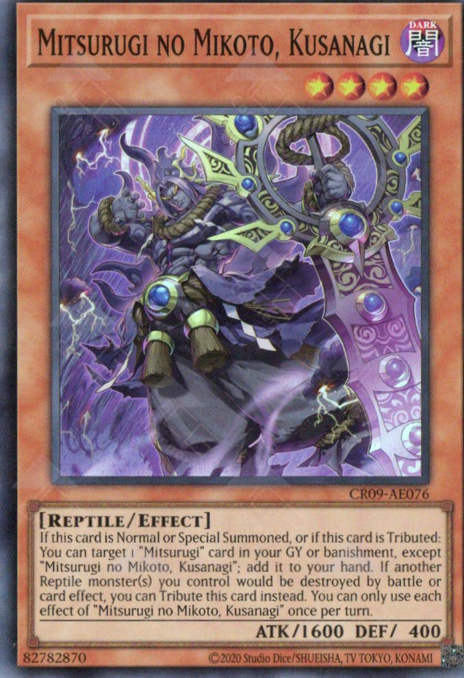 If this card is Normal Summon or Special Summoned, or if this card is Tributed: You can target 1 “Mitsurugi” card in your GY or banishment, except “Mitsurugi no Mikoto, Kusanagi”; Add a card it to your hand. If another Reptile monster(s) you control would be destroyed by battle or card effect, you can Tribute this card instead. You can only use each effect of “Mitsurugi no Mikoto, Kusanagi” once per turn.