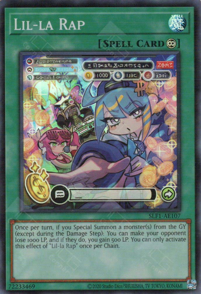 Once per turn, if you Special Summon a monster(s) from the GY (except during the Damage Step): You can make your opponent lose 1000 LP, and if they do, you gain 500 LP. You can only activate this effect of “Lil-la Rap” once per Chain.