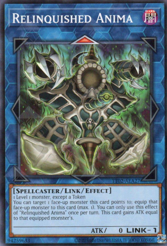 You can target 1 face-up monster this card points to; equip that face-up monster to this card (max. 1). You can only use this effect of “Relinquished Anima” once per turn. This card gains ATK equal to that equipped monster’s.